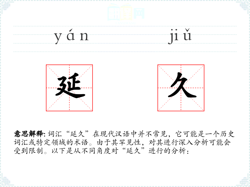 “延久”字面意思是指时间延长或持续很久。其中,“延”意味着延长或推迟,“久”表示时间长。