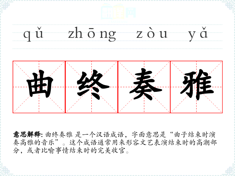 曲终奏雅 是一个汉语成语,字面意思是“曲子结束时演奏高雅的音乐”。这个成语通常用来形容文艺表演结束时的高潮部分,或者比喻事情结束时的完美收官。