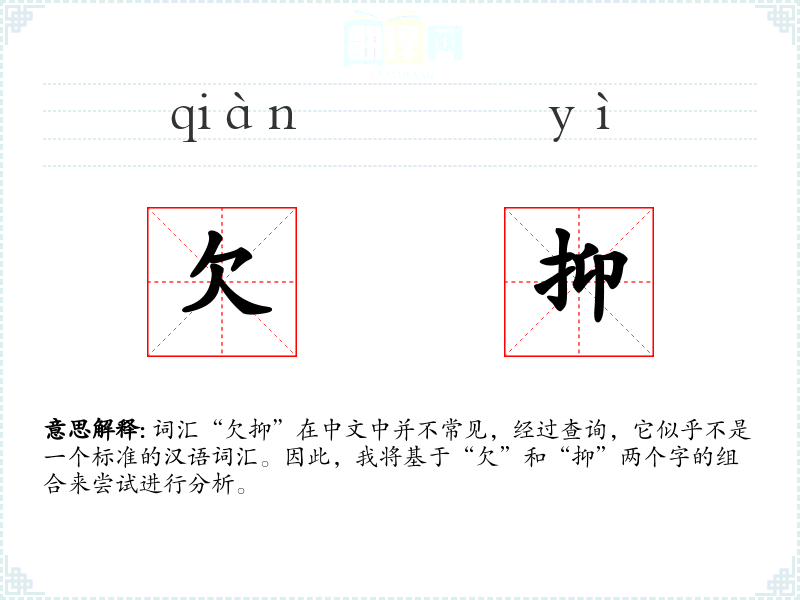 词汇“欠抑”在中文中并不常见,经过查询,它似乎不是一个标准的汉语词汇。因此,我将基于“欠”和“抑”两个字的组合来尝试进行分析。