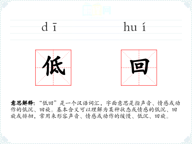 “低回”是一个汉语词汇,字面意思是指声音、情感或动作的低沉、回旋。基本含义可以理解为某种状态或情感的低沉、回旋或徘徊,常用来形容声音、情感或动作的缓慢、低沉、回旋。