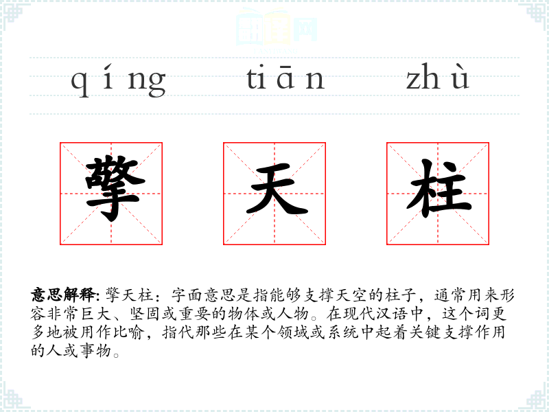 擎天柱:字面意思是指能够支撑天空的柱子,通常用来形容非常巨大、坚固或重要的物体或人物。在现代汉语中,这个词更多地被用作比喻,指代那些在某个领域或系统中起着关键支撑作用的人或事物。