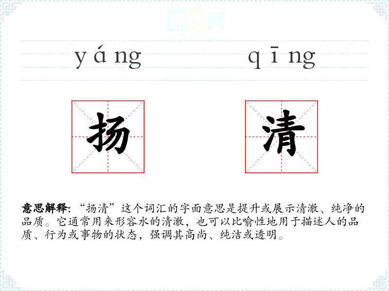 “扬清”由两个汉字组成,“扬”意为提升、展示,“清”意为清澈、纯净。这个词汇在古代文学中已有使用,随着时间推移,其使用范围和语境有所扩展,但基本含义保持不变。