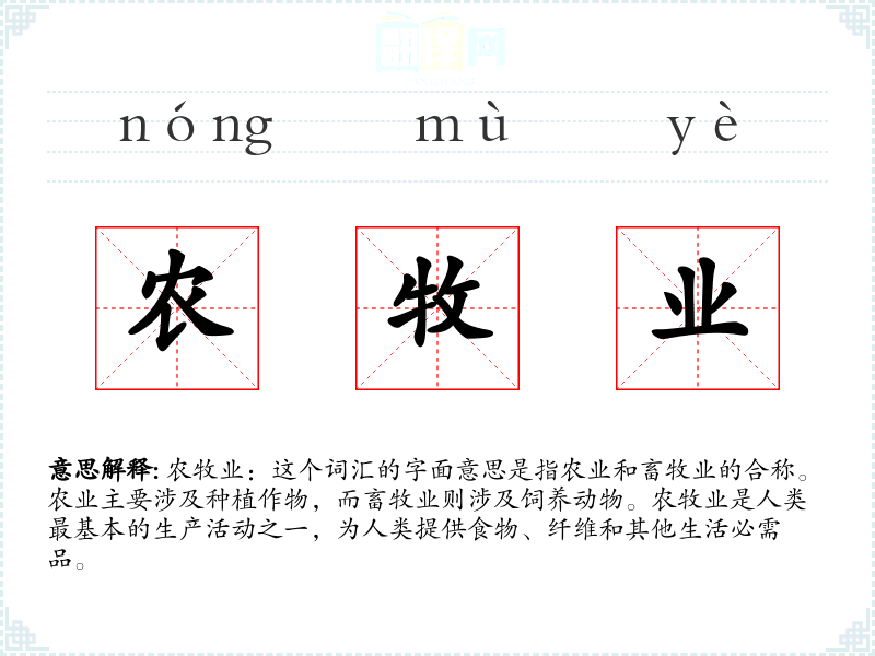 “农牧业”一词在中文中由“农”和“牧”两个字组成,分别代表农业和畜牧业。这两个字在古代汉语中就已经存在,随着时间的推移,它们的含义逐渐扩展,最终形成了现代意义上的“农牧业”。