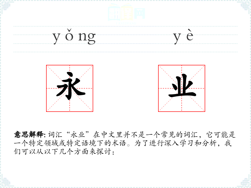 词汇“永业”在中文里并不是一个常见的词汇,它可能是一个特定领域或特定语境下的术语。为了进行深入学习和分析,我们可以从以下几个方面来探讨: