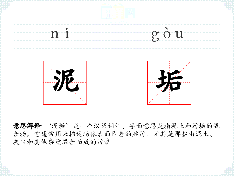 “泥垢”一词由“泥”和“垢”两个字组成。“泥”指的是泥土,而“垢”则指污垢。这两个字组合在一起,形成了描述泥土和污垢混合物的词汇。在古代汉语中,“泥垢”就已经存在,且其基本含义至今未变。