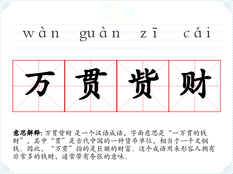 万贯赀财 的词源可以追溯到**古代的货币制度。随着时间的推移,这个成语的含义和用法基本保持不变,但在现代汉语中,由于货币单位的改变,其具体数值的含义已经变得模糊,更多地被用作比喻或夸张。