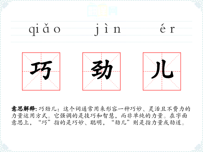 巧劲儿:这个词通常用来形容一种巧妙、灵活且不费力的力量运用方式。它强调的是技巧和智慧,而非单纯的力量。在字面意思上,“巧”指的是巧妙、聪明,“劲儿”则是指力量或劲道。