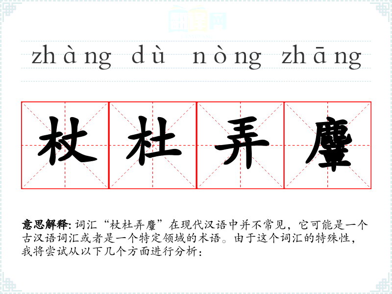 词汇“杖杜弄麞”在现代汉语中并不常见,它可能是一个古汉语词汇或者是一个特定领域的术语。由于这个词汇的特殊性,我将尝试从以下几个方面进行分析: