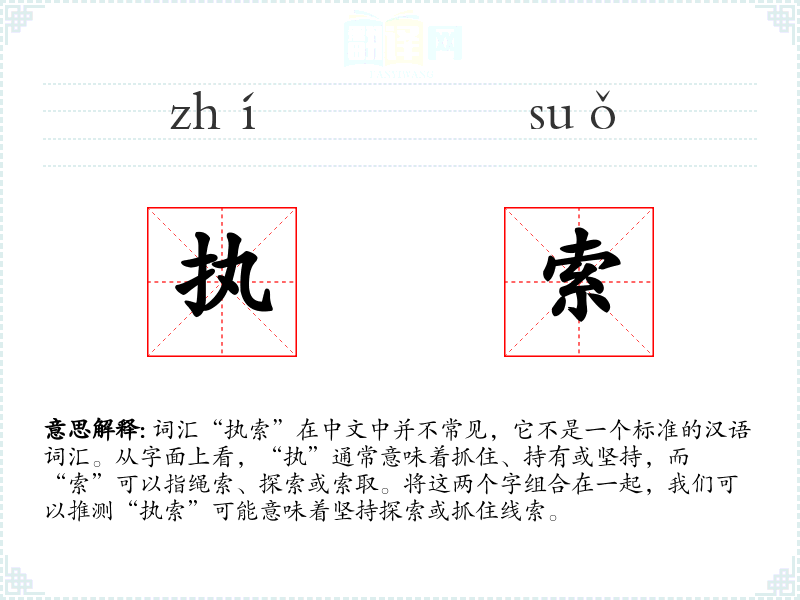 词汇“执索”在中文中并不常见,它不是一个标准的汉语词汇。从字面上看,“执”通常意味着抓住、持有或坚持,而“索”可以指绳索、探索或索取。将这两个字组合在一起,我们可以推测“执索”可能意味着坚持探索或抓住线索。