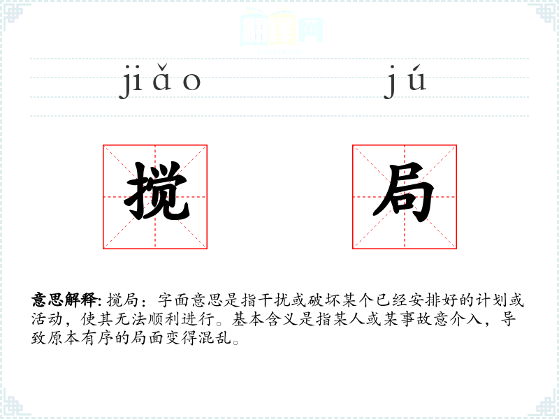 搅局:字面意思是指干扰或破坏某个已经安排好的计划或活动,使其无法顺利进行。基本含义是指某人或某事故意介入,导致原本有序的局面变得混乱。