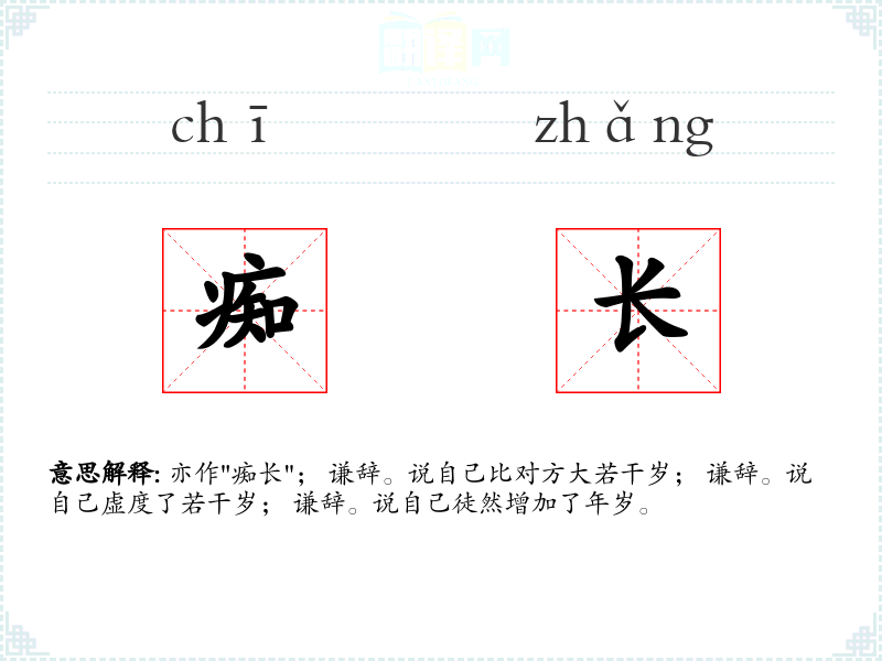亦作"痴长"; 谦辞。说自己比对方大若干岁; 谦辞。说自己虚度了若干岁; 谦辞。说自己徒然增加了年岁。