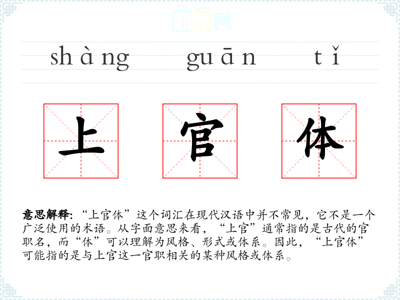 “上官体”这个词汇在现代汉语中并不常见,它不是一个广泛使用的术语。从字面意思来看,“上官”通常指的是古代的官职名,而“体”可以理解为风格、形式或体系。因此,“上官体”可能指的是与上官这一官职相关的某种风格或体系。