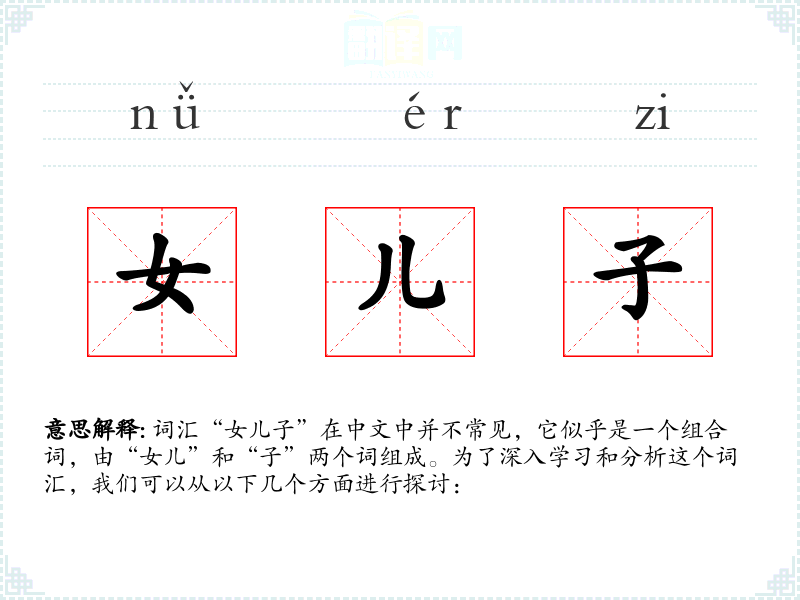 词汇“女儿子”在中文中并不常见,它似乎是一个组合词,由“女儿”和“子”两个词组成。为了深入学习和分析这个词汇,我们可以从以下几个方面进行探讨: