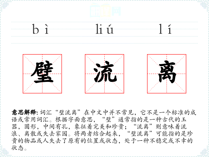 由于“璧流离”不是一个常用词汇,它在文学、口语或专业领域中的使用非常有限。可能在一些古文或特定文学作品中出现,用以表达一种深沉的失落感或不幸。