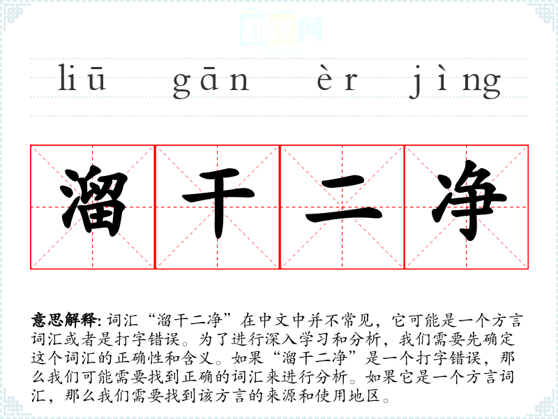 词汇“溜干二净”在中文中并不常见,它可能是一个方言词汇或者是打字错误。为了进行深入学习和分析,我们需要先确定这个词汇的正确性和含义。如果“溜干二净”是一个打字错误,那么我们可能需要找到正确的词汇来进行分析。如果它是一个方言词汇,那么我们需要找到该方言的来源和使用地区。