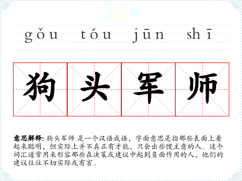 狗头军师 是一个汉语成语,字面意思是指那些表面上看起来聪明,但实际上并不真正有才能,只会出些馊主意的人。这个词汇通常用来形容那些在决策或建议中起到负面作用的人,他们的建议往往不切实际或有害。