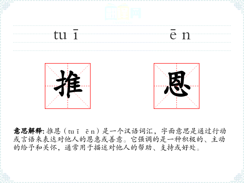 推恩(tuī ēn)是一个汉语词汇,字面意思是通过行动或言语来表达对他人的恩惠或善意。它强调的是一种积极的、主动的给予和关怀,通常用于描述对他人的帮助、支持或好处。