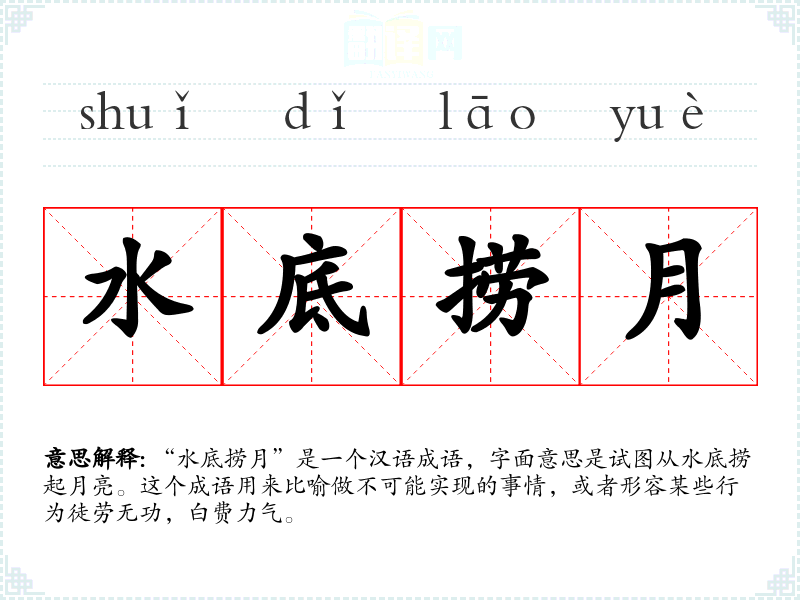 “水底捞月”是一个汉语成语,字面意思是试图从水底捞起月亮。这个成语用来比喻做不可能实现的事情,或者形容某些行为徒劳无功,白费力气。