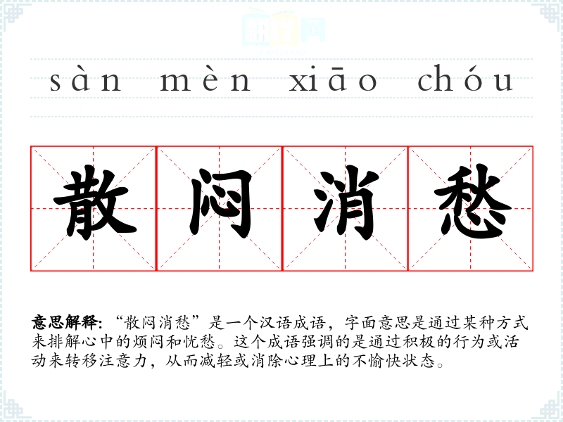 “散闷消愁”是一个汉语成语,字面意思是通过某种方式来排解心中的烦闷和忧愁。这个成语强调的是通过积极的行为或活动来转移注意力,从而减轻或消除心理上的不愉快状态。