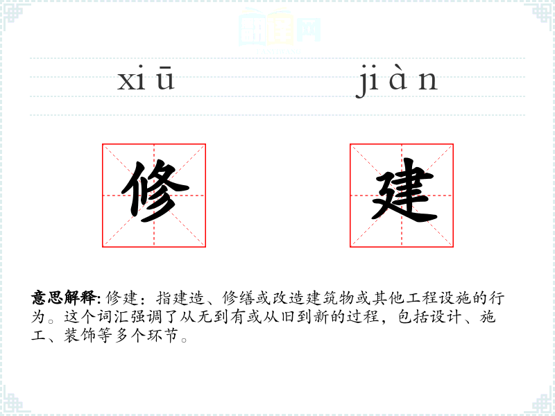 修建:指建造、修缮或改造建筑物或其他工程设施的行为。这个词汇强调了从无到有或从旧到新的过程,包括设计、施工、装饰等多个环节。