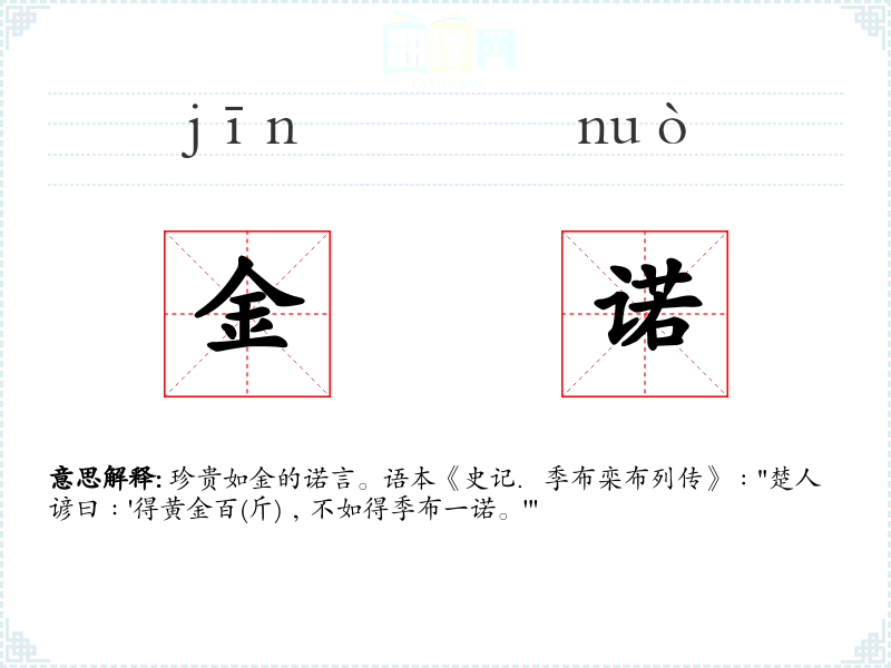 珍贵如金的诺言。语本《史记.季布栾布列传》﹕"楚人谚曰﹕'得黄金百(斤)﹐不如得