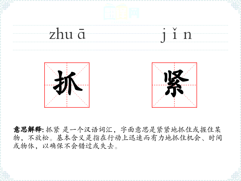 抓紧 是一个汉语词汇,字面意思是紧紧地抓住或握住某物,不放松。基本含义是指在行动上迅速而有力地抓住机会、时间或物体,以确保不会错过或失去。