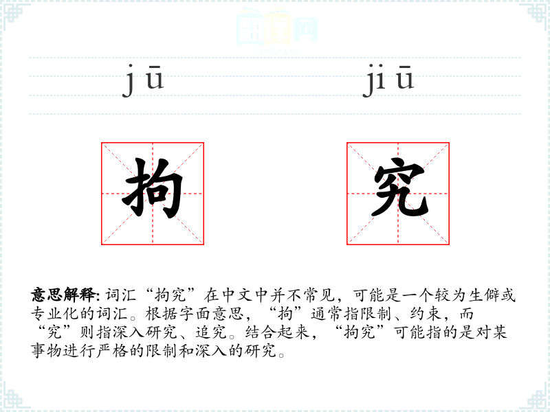 - 理解:“拘究”是一个强调严谨和细致的词汇,适用于需要严格审查和深入研究的场合。