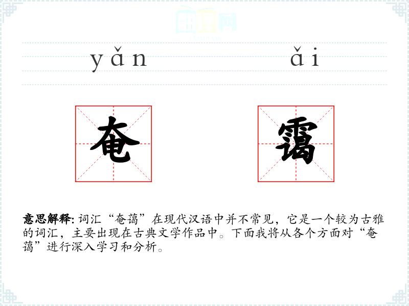词汇“奄蔼”在现代汉语中并不常见,它是一个较为古雅的词汇,主要出现在古典文学作品中。下面我将从各个方面对“奄蔼”进行深入学习和分析。