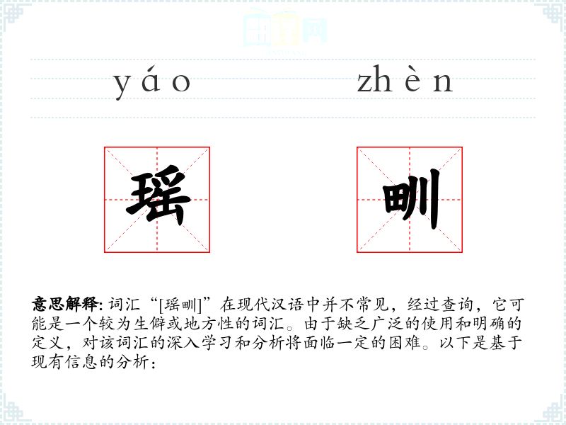 词汇“[瑶甽]”在现代汉语中并不常见,经过查询,它可能是一个较为生僻或地方性的词汇。由于缺乏广泛的使用和明确的定义,对该词汇的深入学习和分析将面临一定的困难。以下是基于现有信息的分析: