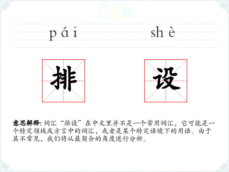 由于“排设”不是一个标准词汇,它在不同语境下的使用可能非常有限。在某些特定的技术或工程领域,它可能指的是对设备或物体的排列和设置。