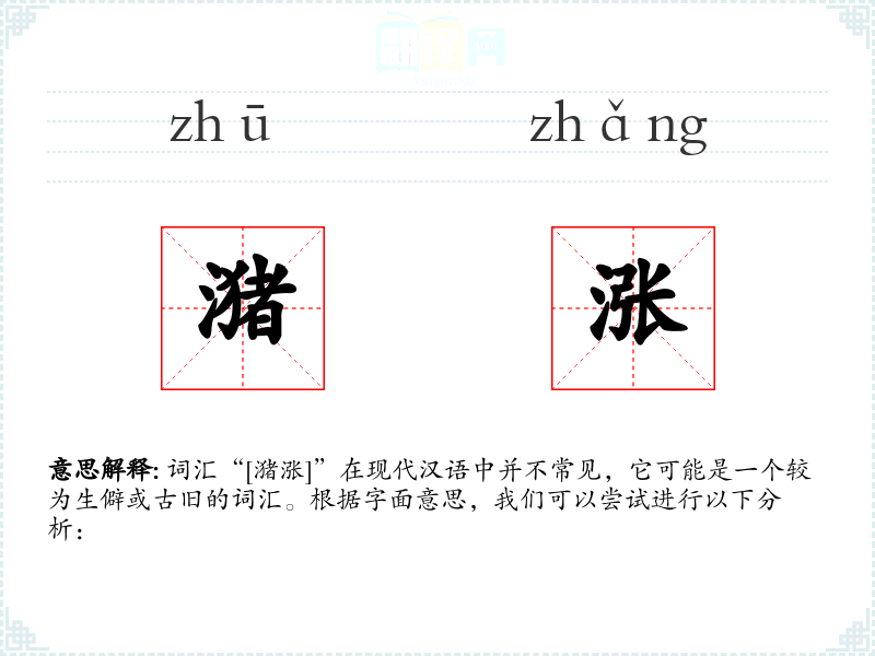 词汇“[潴涨]”在现代汉语中并不常见,它可能是一个较为生僻或古旧的词汇。根据字面意思,我们可以尝试进行以下分析: