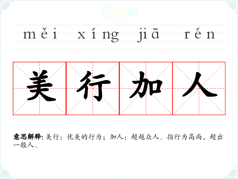美行:优美的行为;加人:超越众人。指行为高尚,超出一般人。