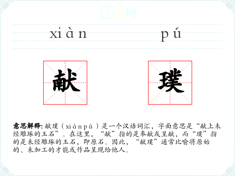 “献璞”这个词汇源自古代对玉石的加工和鉴赏文化。在古代,玉石被视为珍贵的物品,未经雕琢的玉石(璞)被认为蕴含着无限的可能性和价值。随着时间的推移,这个词汇逐渐被用来比喻人的才能和作品的原始状态。