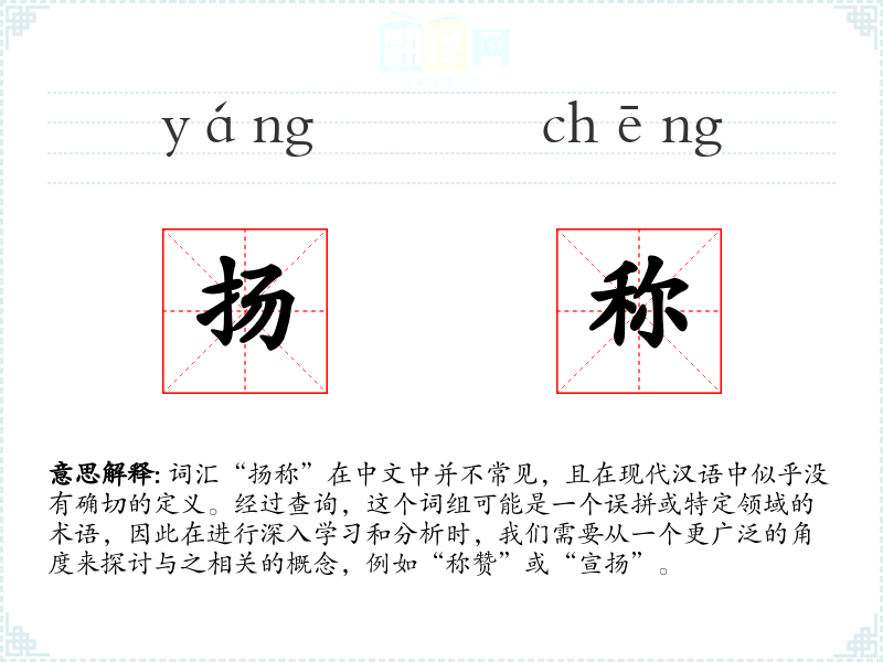 词汇“扬称”在中文中并不常见,且在现代汉语中似乎没有确切的定义。经过查询,这个词组可能是一个误拼或特定领域的术语,因此在进行深入学习和分析时,我们需要从一个更广泛的角度来探讨与之相关的概念,例如“称赞”或“宣扬”。