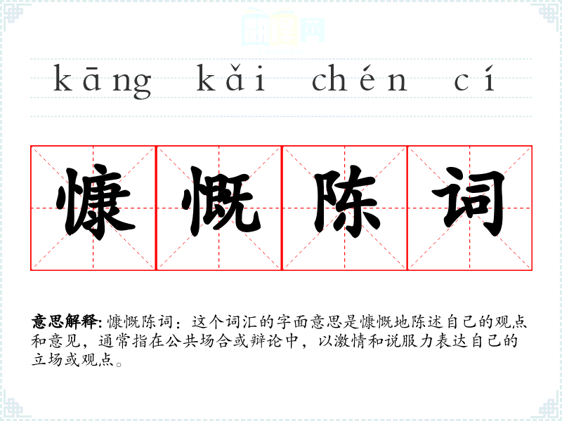 慷慨陈词:这个词汇的字面意思是慷慨地陈述自己的观点和意见,通常指在公共场合或辩论中,以激情和说服力表达自己的立场或观点。