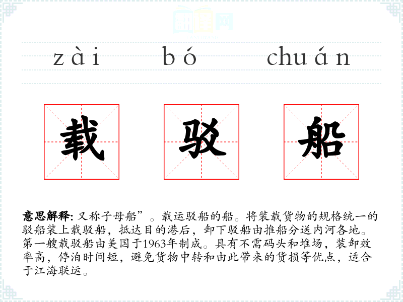 1.又称子母船”。载运驳船的船。将装载货物的规格统一的驳船装上载驳船,抵达目的港后,卸下驳船由推船分送内河各地。第一艘载驳船由美国于1963年制成。具有不需码头和堆场,装卸效率高,停泊时间短,避免货物中转和由此带来的货损等优点,适合于江海联运。