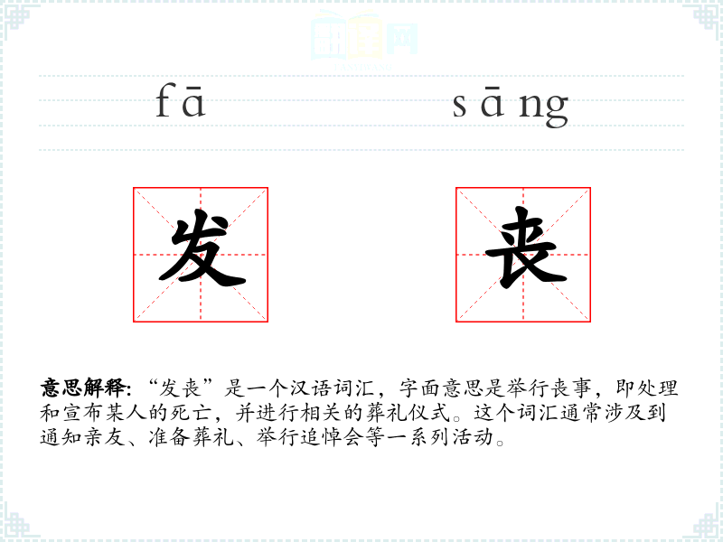 - 反义词:庆生、喜宴(这些词汇与“发丧”形成鲜明对比,一个是关于死亡的悲伤仪式,一个是关于生命的庆祝活动)