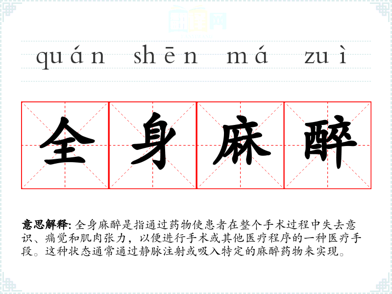 - 专业领域:在医学领域,全身麻醉是一个专业术语,用于描述手术前、中、后的特定医疗程序。