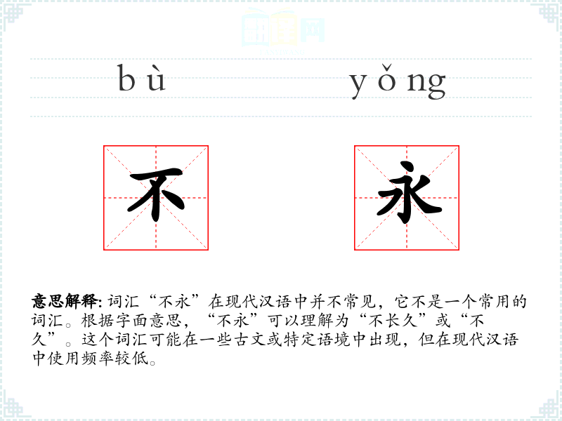 - 理解:“不永”是一个表达事物短暂性的词汇,虽然在现代汉语中不常用,但在某些语境下仍然有其独特的表达效果。
