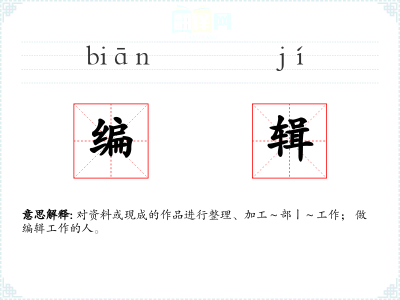 对资料或现成的作品进行整理、加工~部ㄧ~工作; 做编辑工作的人。