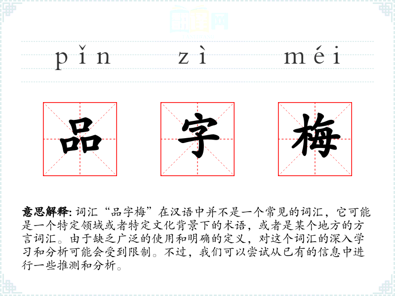 词汇“品字梅”在汉语中并不是一个常见的词汇,它可能是一个特定领域或者特定文化背景下的术语,或者是某个地方的方言词汇。由于缺乏广泛的使用和明确的定义,对这个词汇的深入学*和分析可能会受到限制。不过,我们可以尝试从已有的信息中进行一些推测和分析。
