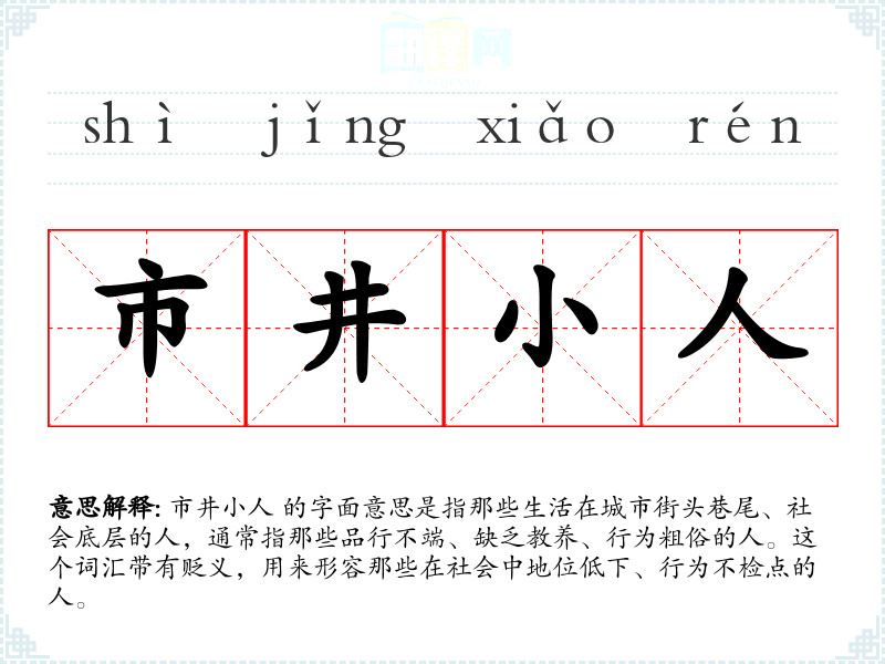 市井小人 的字面意思是指那些生活在城市街头巷尾、社会底层的人,通常指那些品行不端、缺乏教养、行为粗俗的人。这个词汇带有贬义,用来形容那些在社会中地位低下、行为不检点的人。