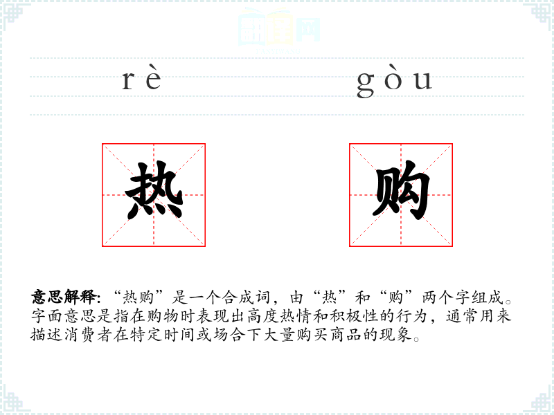 “热购”是一个合成词,由“热”和“购”两个字组成。字面意思是指在购物时表现出高度热情和积极性的行为,通常用来描述消费者在特定时间或场合下大量购买商品的现象。