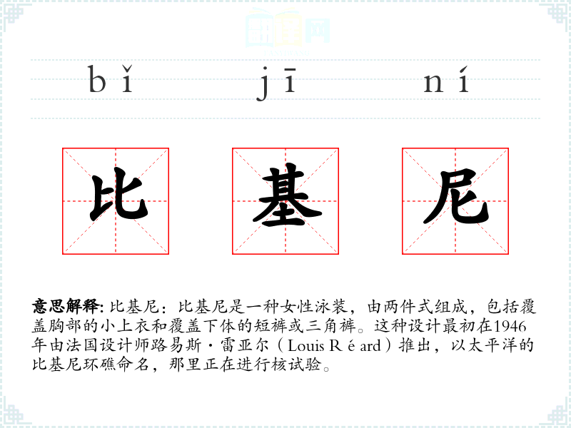 比基尼一词源于比基尼环礁,这是一个位于太平洋的环礁,因194*年美国在此进行核试验而闻名。设计师路易斯·雷亚尔选择这个名字,意在暗示他的设计同样具有“爆炸性”的影响。