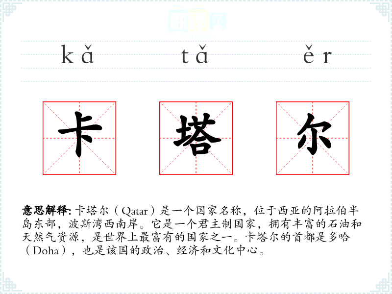 卡塔尔(Qatar)是一个国家名称,位于西亚的阿拉伯半岛东部,波斯湾西南岸。它是一个君主制国家,拥有丰富的石油和天然气资源,是世界上最富有的国家之一。卡塔尔的首都是多哈(Doha),也是该国的政治、经济和文化中心。