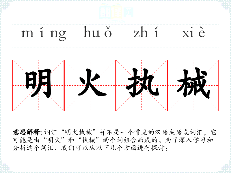 词汇“明火执械”并不是一个常见的汉语成语或词汇,它可能是由“明火”和“执械”两个词组合而成的。为了深入学*和分析这个词汇,我们可以从以下几个方面进行探讨: