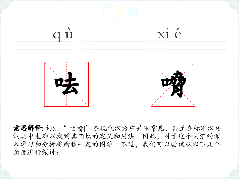 由于“[呿嗋]”不是一个标准的汉语词汇,我们无法给出其确切的字面意思和基本含义。它可能是一个方言词汇、古语词汇或者是某种特定语境下的用语。
