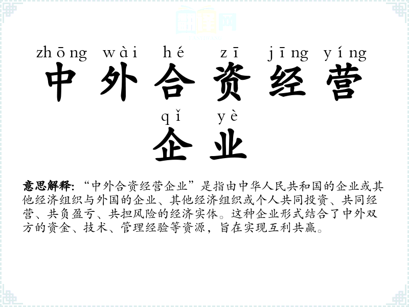 “中外合资经营企业”是指由中华人民共和国的企业或其他经济组织与外国的企业、其他经济组织或个人共同投资、共同经营、共负盈亏、共担风险的经济实体。这种企业形式结合了中外双方的资金、技术、管理经验等资源,旨在实现互利共赢。