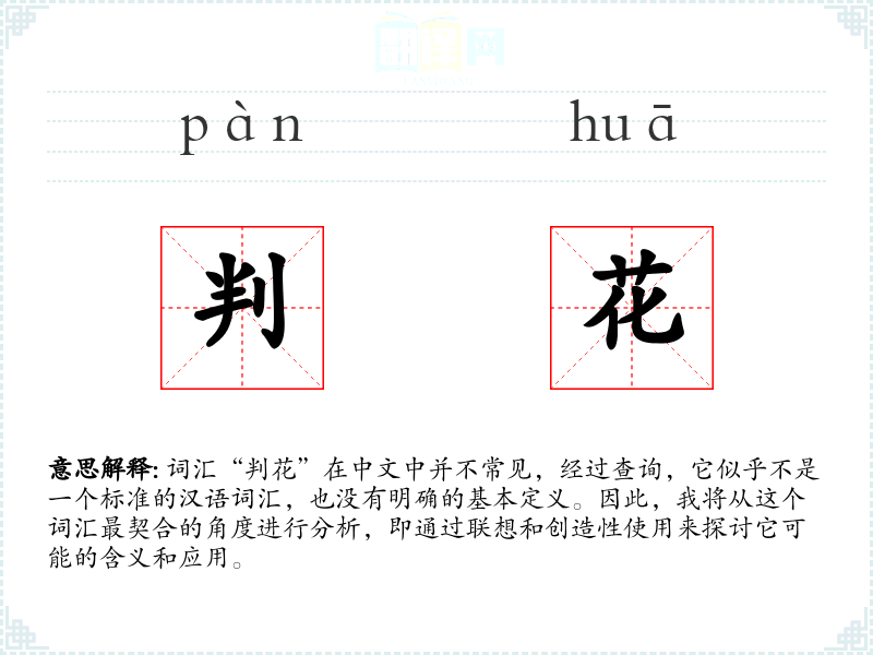 词汇“判花”在中文中并不常见,经过查询,它似乎不是一个标准的汉语词汇,也没有明确的基本定义。因此,我将从这个词汇最契合的角度进行分析,即通过联想和创造性使用来探讨它可能的含义和应用。