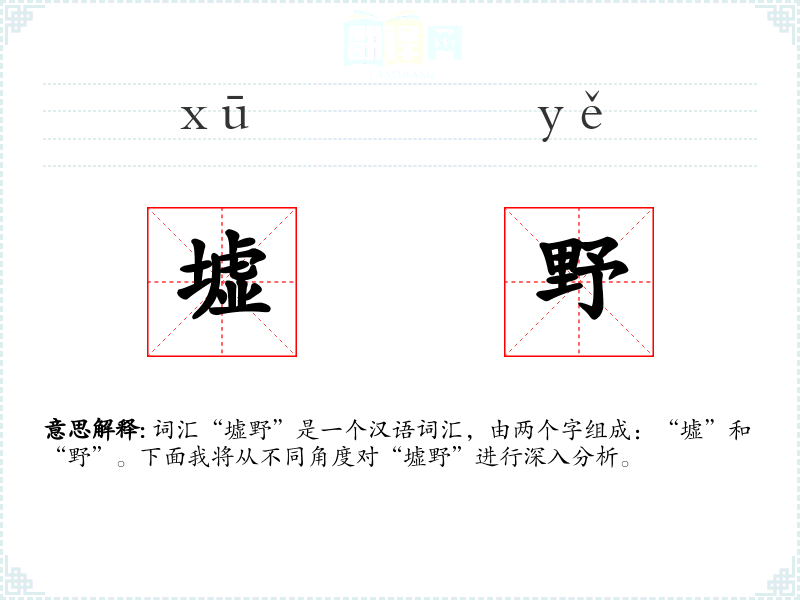 - 词源:“墟”字最早见于甲骨文,原意为土堆,后引申为废墟。“野”字则较早,指田野或野外。